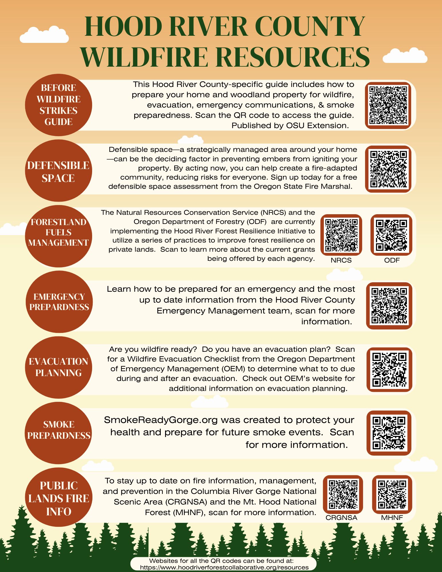 One pager for residents of Hood River County showing QR codes for guides covering a variety of topics such as defensible space, emergency preparedness, and smoke preparedness.
